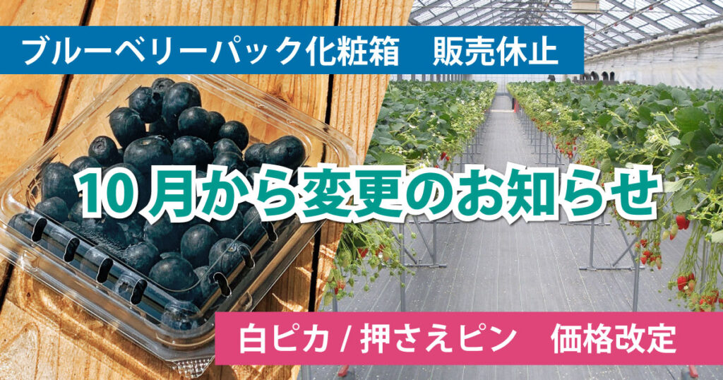 お知らせ 10月からの販売休止/価格改定の商品について いつもオーシャン貿易オンラインショップブログをご覧いただき、誠にありがとうございます! 10月より一部商品につきまして販売休止・価格改定がございますのでお知らせいたします。 ブルーベリーパック/化粧箱の販売休止について ブルーベリー用のパッ... 2022.09.28 お知らせ価格改定/規格変更のお知らせ果実用パック/化粧箱防草シート/押えピン等