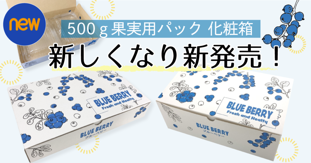 ブルーベリー化粧箱 新500g果実用パック用の化粧箱が5月14日より販売開始します! いつもオーシャン貿易オンラインショップブログをご覧いただき、誠にありがとうございます。 2024年度より廃番終了いたしました「500g果実用パック」の後継品について、 先のブログにてご案内させていただきました。 / / その際、対応の化粧箱... 2024.05.13 ブルーベリー化粧箱新商品のお知らせ果実用パック/化粧箱